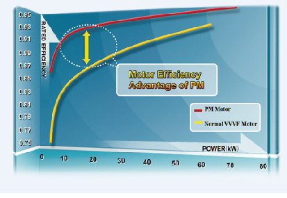 采用了具有巨大節能效率的、性能優越的永久磁石(IPM)電機,搭載新一代寬量程永磁變頻控制系統,發揮出通用感應電機無法比擬的節能效果,與普通變頻電機(感應電機)相比,電機節能7%以上。